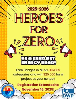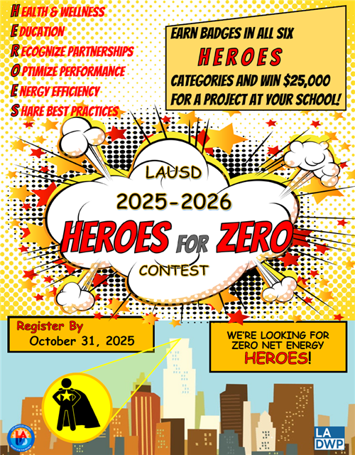 The Eco-Sustainability Office presents the HEROES for Zero Contest! HEROES for Zero challenges K-12 student teams to help make their schools “Zero Net Energy (ZNE) Ready” by reducing energy consumption, maximizing energy efficiency, and educating fellow students and staff. Teachers are encouraged to connect ZNE activities with the STEAM curriculum. Teams can earn badges in six HEROES categories and win up to $25,000 for sustainability-related projects at their schools! Register HERE.