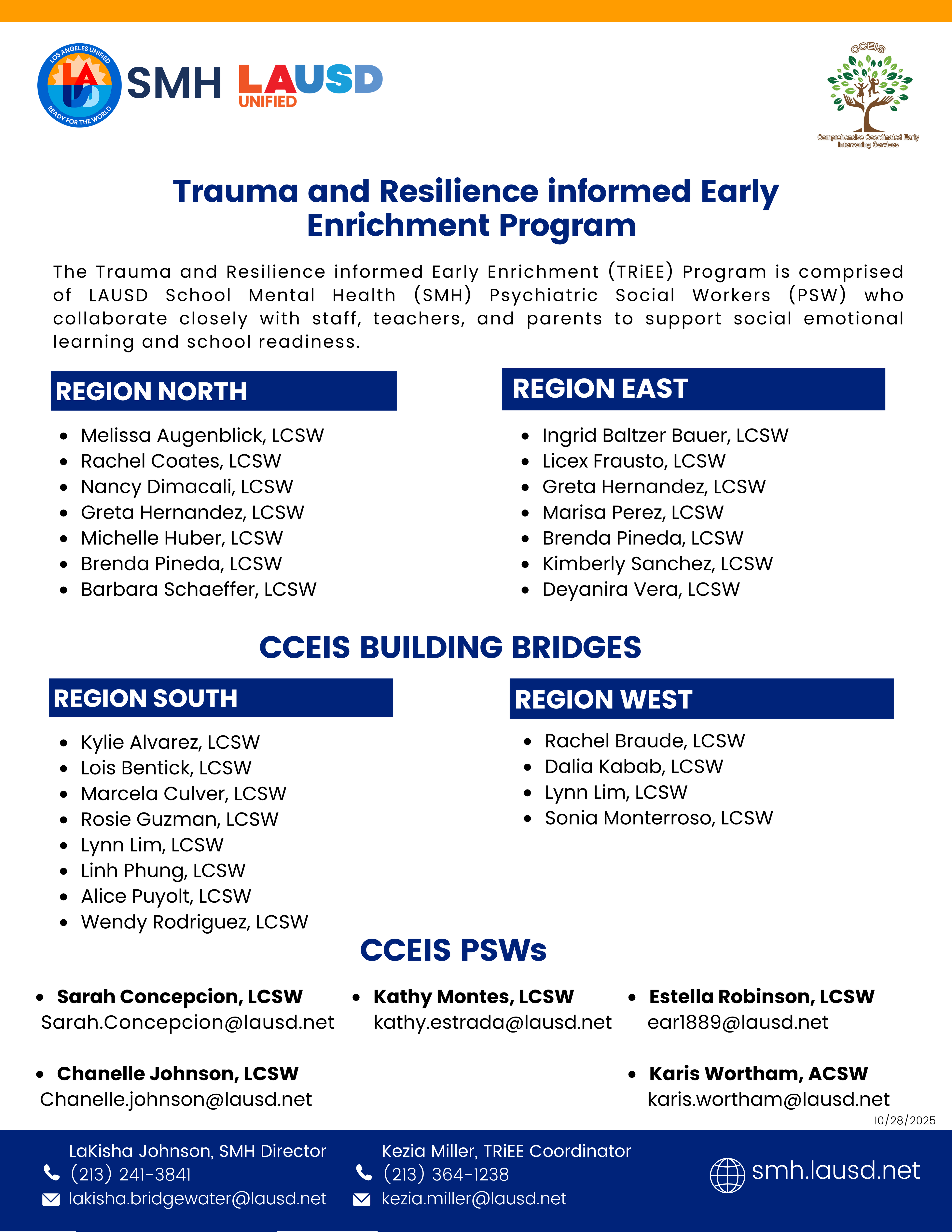 Name Title Email Kezia Miller Coordinator kezia.miller@lausd.net Samantha Calderon Program Facilitator samantha.calderon@lausd.net Yirley Corea Program Facilitator yirley.corea@lausd.net Joann Palma Program Facilitator joann.palma@lausd.net